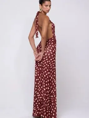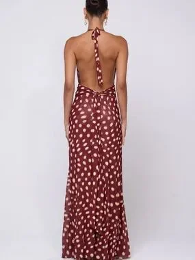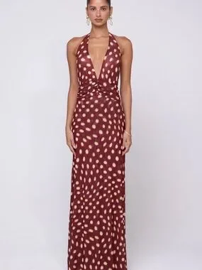 Deep halter V-neck maxi with a ruched waist. Lightweight drape and fluid silhouette. Cream spot print on a rich burgundy base. Elegant choice for evening wear.