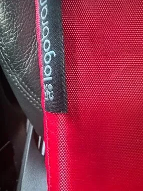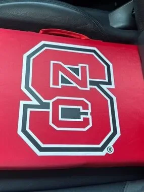 Bright red folder with bold logo on front. Sturdy-looking handle on side. Graphic logo detail in white and black. Clean, eye-catching design. Seat cushion- NC state Wolfpack