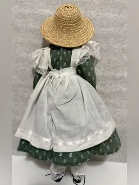 Classic red-haired doll wearing a green dress with floral accents. Comes with a pink purse and detailed boots. Soft, lifelike styling and braided hair for play and display. Green color featured throughout outfit.