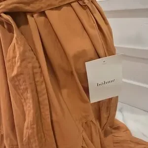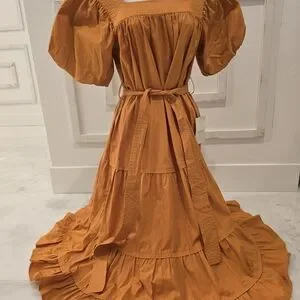 bohme cotton maxi dress in a warm rust orange. Puff sleeves and smocked square neckline. Tiered skirt with removable self-tie belt. Flowing, lightweight construction for easy wear.