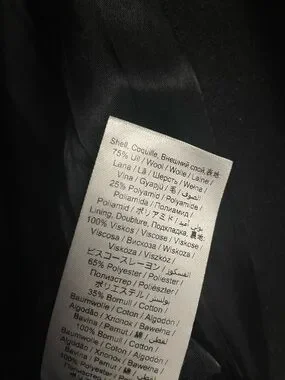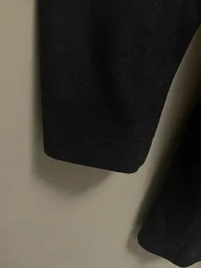 Long sleeve brushed wool coat in black. Stand collar and concealed button closure at front. Welt pockets at waist. Lightly padded shoulders. Central vent at back hem. Welt pocket at fully lined interior. European 54 which correlates to a US 44 or Large/XL. Please see measurements to confirm size.