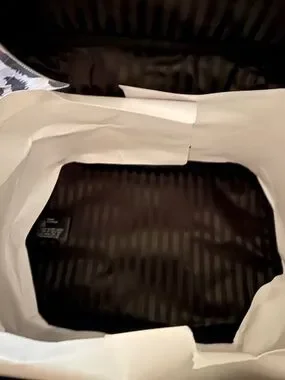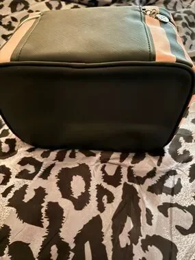 Structured cosmetic case with bold vertical stripes. Top carry handle for portability. Zipper closure keeps contents secure. Branded lettering on front for signature style.