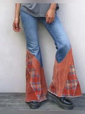 “Flashback" patchwork flare jeans from the We The Free collection by Free People. They feature a high-rise silhouette with a dramatic bell-bottom leg. The design combines a medium-wash denim with vibrant patchwork panels in orange corduroy and a red/tan plaid flannel.