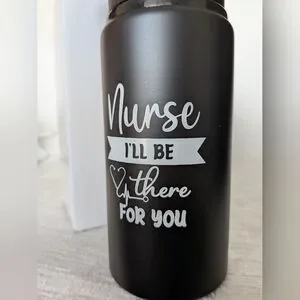 Black water bottle with nurse-themed design. Features a black lid.