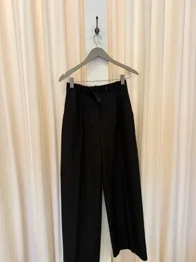 Sophisticated wide-leg trousers with a high-rise waist. Smooth, flowing fabric for elegant drape. Minimal details for a modern, versatile look. Easy to style for both work and casual outfits.