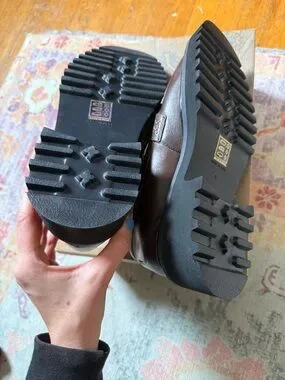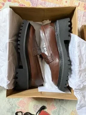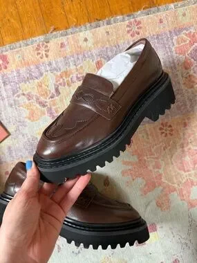 Chunky platform loafers with a ridged sole. Fits true to a 9 or 8.5 with a thick sock!