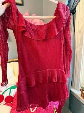 Off-shoulder romper with layered ruffle detail. Stretchy textured knit for a snug fit. Short inseam and dramatic sleeve ties. Bold red shade for a statement look.