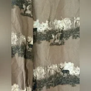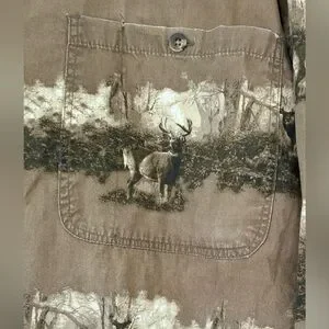 Cabela’s Outfitters Series button front shirt featuring an all-over deer and woodland hunting print. Classic outdoor style perfect for hunting, camping, or casual wear.