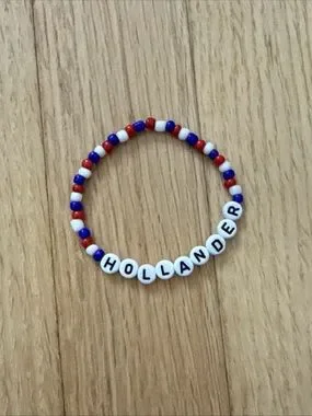 Colorful Heated Rivalry bracelets with red, blue, and white beads. Features letter beads for a playful, personalized look. Lightweight and comfortable for everyday wear. Bright red, blue, and white colors add fun to any outfit.