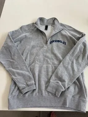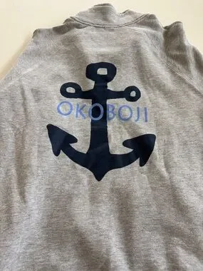 Light gray pullover showcasing a black District tag at the neckline. Soft fleece interior visible. Simple, understated branding detail.