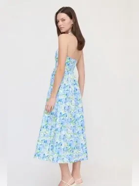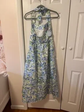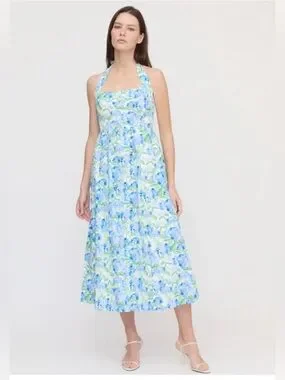 Hill House x La Coqueta Fleur Midi Dress Blue Hydrangea Halter Cotton L NWT