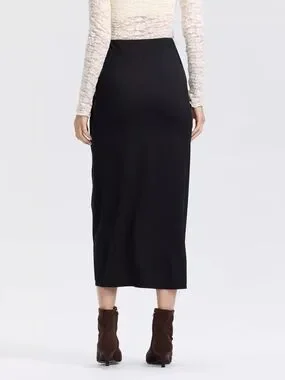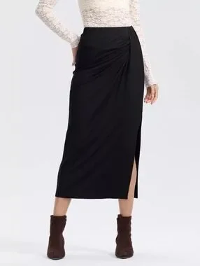 Elegant black midi skirt with a flattering side slit and subtle front gathering. Comfortable, figure-skimming fit ideal for day-to-night wear. Pair with blouses or knit tops for a polished look. Color: black.
