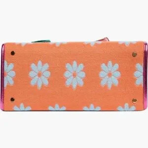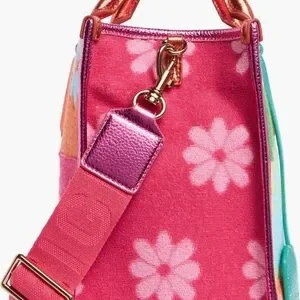Vibrant floral patchwork tote with bold color blocks. Metallic handles and trim add shine. Top handles and structured shape. Fun, playful statement bag.