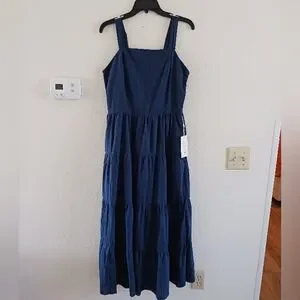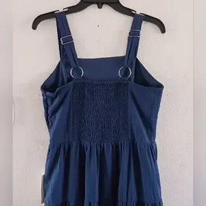 Features a square neckline, adjustable strap ring detail, side pockets, smocked back, lined, Bust 36" Length 53"