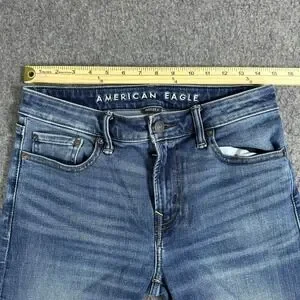 American Eagle Airflex+ jeans in a medium wash offer a versatile look with a comfortable, flexible fit. These denim pants feature a classic five-pocket design, zip fly with button closure, and a signature leather brand patch on the back waistband. The fabric blend includes recycled materials and elastane for enhanced stretch and durability, making them ideal for everyday wear. Subtle whiskering and fading provide a lived-in aesthetic that pairs easily with casual tees or button-downs.