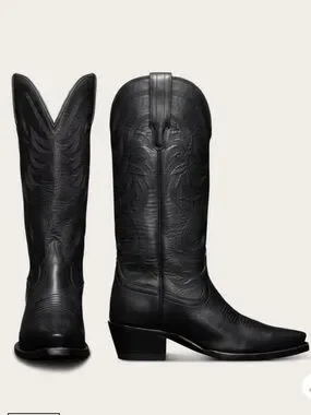 Elegant black leather cowboy boots with refined western stitching. Comfortable pull-on design with sturdy low heel. Sleek pointed toe for timeless style.