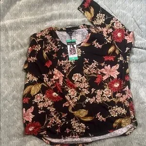 Soft-looking long sleeve top with an allover floral print. Scoop neckline and relaxed fit. Warm gold leaves and red and pink blooms add color. Easy to pair with jeans or skirts.