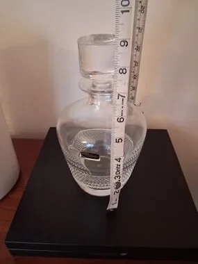 Elegant cut glass decanter with stopper. Classic diamond-cut pattern around the body. Clear glass shines and displays liquids beautifully. Labeled Style Prestige on front. No box, but never used - been sitting on a shelf for a couple of years. Perfect condition.