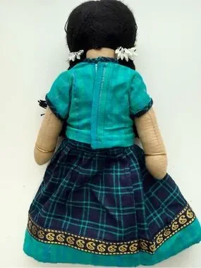 Pair of fabric dolls in colorful traditional attire. One doll wears teal green outfit with braided hair and decorative trim. The other wears pink patterned headscarf and matching pants. Embroidered faces and small jewelry details. Soft textile construction for imaginative play.