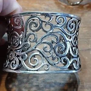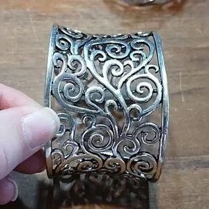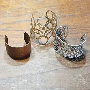Three cuff style bracelets, unmarked. One is etched copper with some tarnish. Other two have filigree pattern, one silver coloured and the other gold coloured. In excellent used condition.