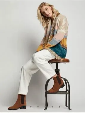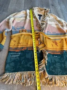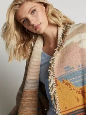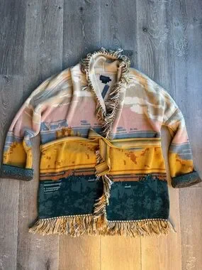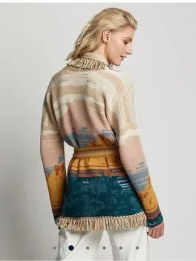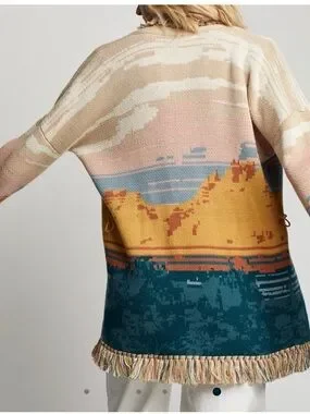 An update of a bestseller, now in luxuriously soft Peruvian cotton, in a pattern inspired by the landscape of the Columbia River Gorge. Oversized fit, with drop shoulders, open front, knotted fringe and optional self-belt. Birdseye knit.