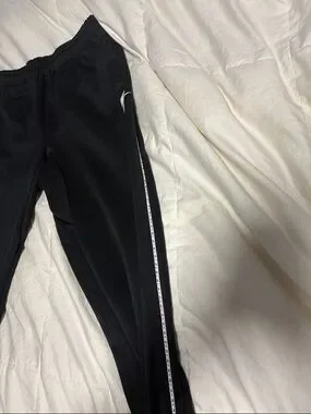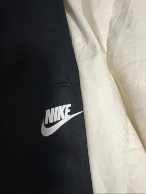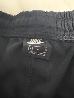 Soft black joggers for everyday play. Elastic waistband and cuffed ankles for secure fit. White Nike logo and subtle side trim detail. Lightweight fabric for active comfort.