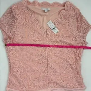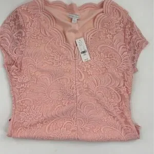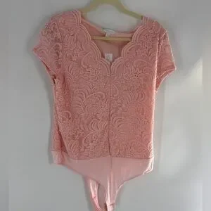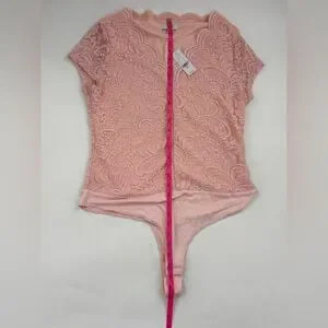 Chic pink lace bodysuit with intricate floral design. Short sleeves and elegant neckline. Perfect for stylish occasions.