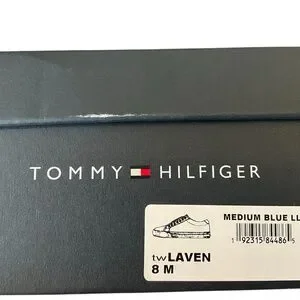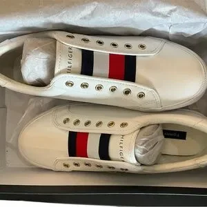 Stylish white sneakers with gold eyelets. Features classic Tommy Hilfiger design.