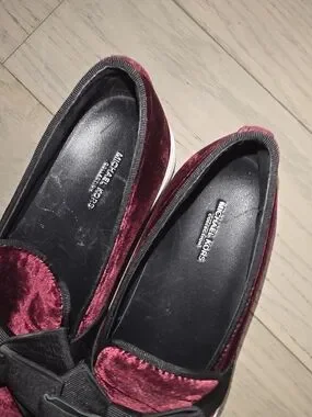 Michael Kors flats in rich burgundy velvet. Black grosgrain bow accent on the vamp. Leather-lined insole for comfort. Elegant low-profile silhouette for versatile wear.