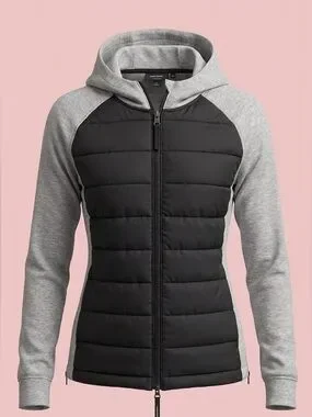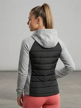 Elevate your athleisure game with this sleek DKNY Sport mixed-media sweatshirt. It features a modern hybrid design with a quilted puffer front for extra warmth and soft, heather grey jersey sleeves and hood for maximum comfort.