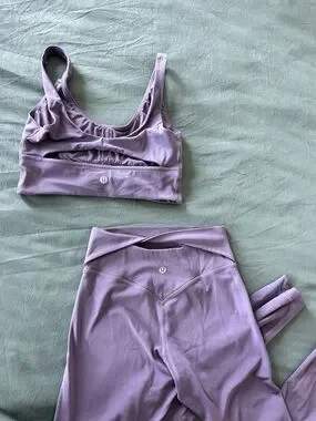 Matching lavender sports bra and high-waist no line align leggings. Lululemon logos visible on both pieces. Soft, muted purple hue. Sleek workout set with flattering waistband detail. Great for yoga or gym. Top size XS (fits like Lulu size 4), bottoms 4 (fit like XS). Worn once and washed.