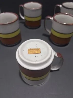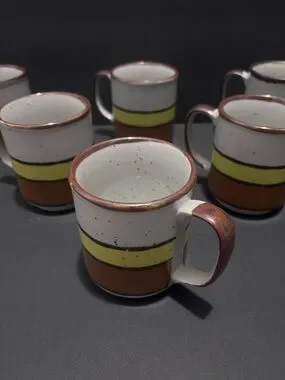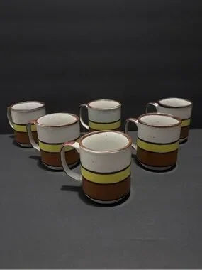 * Set of six (6) Hearthside Buffet Ware No. 555 vintage stoneware coffee mugs with a white base and bold yellow and brown bands. Handcrafted in Japan. Durable ceramic construction with comfortable handles. Rustic speckled glaze adds artisanal charm.