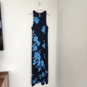 Tommy Bahama navy blue tropical floral sleeveless maxi dress with a keyhole neckline.