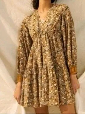 ANTHROPLOGIE Mustard Floral V-Neck Tiered Dress