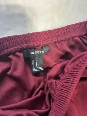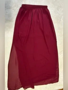 Elegant burgundy maxi skirt with flattering side slits. Soft, flowy fabric for comfortable all-day wear. Elastic waistband for an easy, secure fit. Versatile style that pairs well with dressy or casual tops.