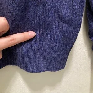 This is a solid, knit sweater from Cambridge Classics in a men’s size L. It is 100% cotton and machine washable. The main color is navy blue and there’s a cream colored stripe around the collar. The only flaws are a small hole towards the bottom front of the sweater (5th pic) and a tiny pink discoloration at the bottom left on the front of the sweater (6th pic). Other than that, the sweater is in great condition with plenty of life left!