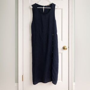 Effortless and timeless navy linen dress by Lungo L’arno in size 1X. This sleeveless midi features a relaxed silhouette, scoop neckline, and subtle side button detailing for a touch of understated charm.