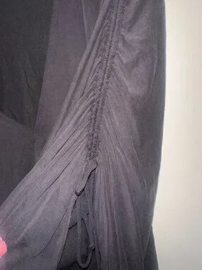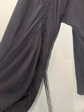 Features V‑neckline, ruched sleeves and sides, and draped silhouette.