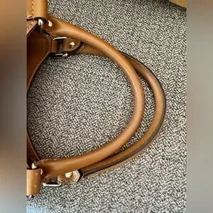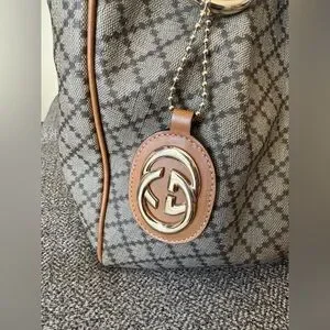 Classic patterned tote in brown and tan. Features tan leather handles and trim for a polished look. Versatile enough for daily use and pairs well with neutral outfits. Secure top and structured silhouette for easy organization.