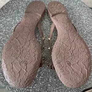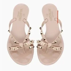 Barely worn Valentino Garavani peachy-tan rockstud rubber thong sandals. Bow detail with signature pyramid studs. Smooth glossy finish and easy slip-on style - great for vacation!