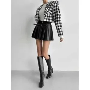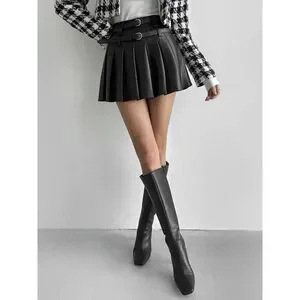 Keywords: black pleated skirt, mini skirt, school girl skirt, preppy style, double buckle belt, pleated mini skirt, versatile skirt, chic skirt, fashion staple, trendy skirt