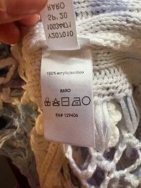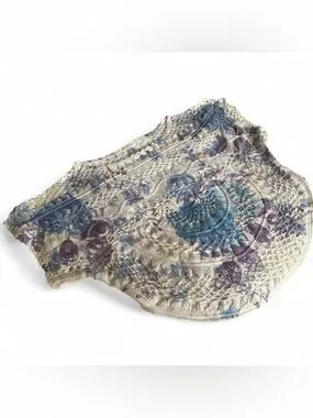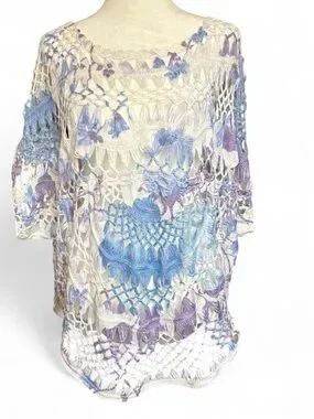 Open weave crochet knit top in a soft white base with blue and lavender detailing throughout. Features a wide neckline, relaxed fit, and airy open knit texture.