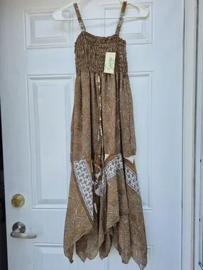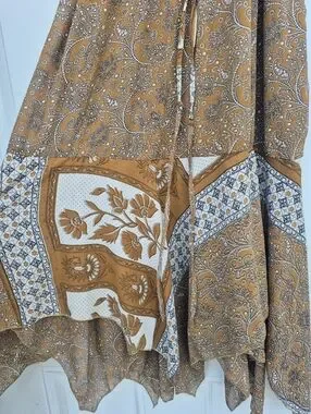 Brown Paisley Hippie Boho Bohemian Recycled Sari Silk Patchwork Midi Dress Small