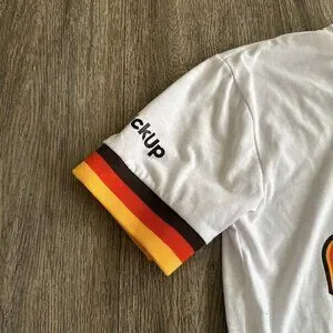 Classic white Padres short-sleeve jersey featuring bold orange lettering and contrasting trim. Lightweight, breathable fabric for everyday wear. V-neck with orange, brown, and yellow striped collar and sleeve cuffs. Team-inspired style perfect for fans and casual outfits.