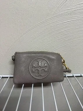 Tory Burch pebbled leather wristlet. Features embossed logo on the front and gold-tone hardware. Compact and versatile for essentials. Easy to carry with a detachable wrist strap.