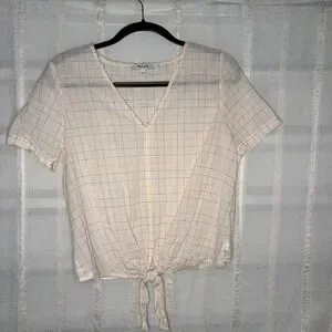 Keywords: Windowpane, Grid, Tie Front, Preppy, Minimalist, Coastal, Summer, Casual, Office, Cotton Blend, Madewell Top, Multi Color, V-Neck, Short Sleeve, Classic