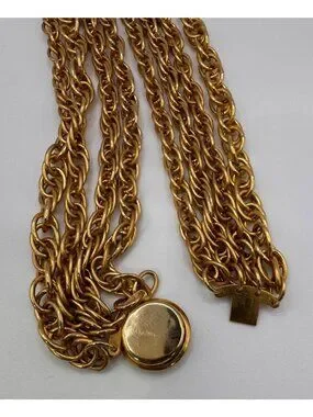 Bold vintage multi 4 strand gold tone chain necklace with a rich, layered look and substantial weight. Features multiple strands of textured link chains gathered into a smooth, rounded clasp for a clean finish.