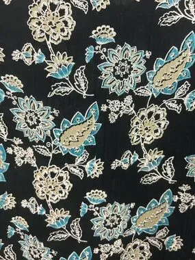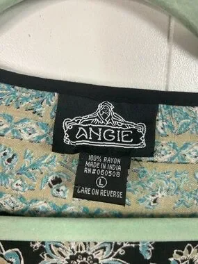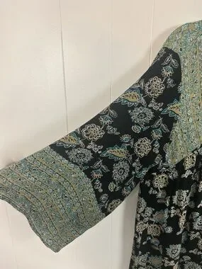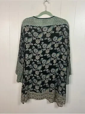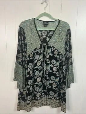Angie Boho Floral Tunic Top V-Neck Bell Sleeve Black Blue Size Large Bohemian