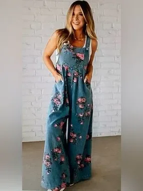 Stylish wide-leg denim jumpsuit by BiBi. Sleeveless with overall-style straps and a square bib. All-over pink floral print on a blue denim base. Front pockets and a relaxed, flowy fit. Easy to dress up or down. Adjustable straps with 3 buttons.