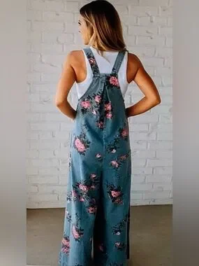 BiBi Blue Floral Denim Jumpsuit with Pink Roses